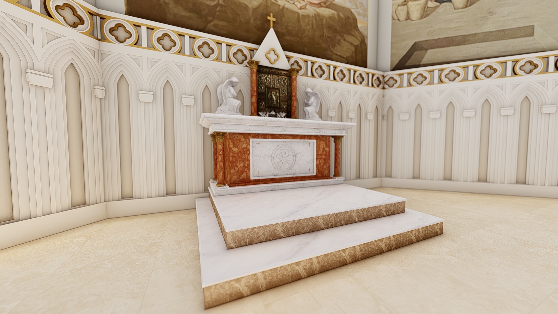 Stations of the Cross, murals, and relief carvings thoughtfully integrated into architectural and liturgical context.